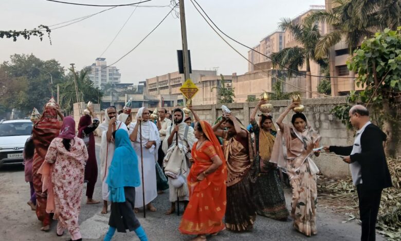 पीपलोद (सूरत)। डुमस रोड स्थित ऑडी कार शोरूम के पीछे श्री शांतिनाथ जैन संघ में जैनाचार्य पूज्य विजय पद्मदर्शनसूरिजी महाराज एवं अन्य श्रमण भगवंतों की पावन पधारामणी के अवसर पर ढोल-नगाड़ों के साथ भव्य सामैया का आयोजन किया गया। पूज्यश्री की आगवानी हेतु श्रद्धालुओं ने भावपूर्ण स्वागत यात्रा निकाली, जिसके पश्चात धर्मसभा का आयोजन हुआ। संघ परिवार एवं समाजजन की बड़ी संख्या में उपस्थिति रही। पूज्यश्री यहां तीन दिनों तक स्थिरता कर अमृतवाणी का आचमन कराएंगे।