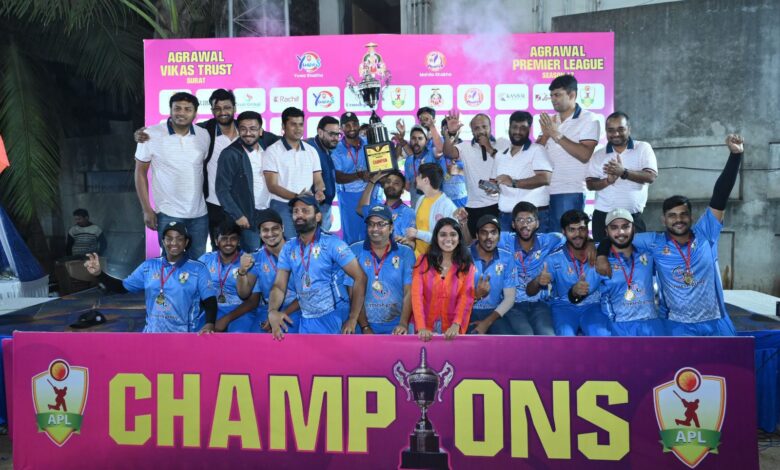 सूरत,अग्रवाल विकास ट्रस्ट युवा शाखा द्वारा आयोजित अग्रवाल प्रीमियम लीग का फाइनल मैच रविवार को अलथान स्थित बीजे पटेल क्रिकेट ग्राउंड में खेला गया। लीग में रिसकाइड डॉमिनेटर्स विजेता एवं वेदांशी रॉयल्स उपविजेता बनी। अंडर-16 ग्रुप में थ्रीसीएस एंड को. रॉयल्स विजेता बनी। तीन दिवसीय लीग का आयोजन स्वदेशी थीम पर रखा गया था। लीग के दौरान ट्रस्ट द्वारा कार्निवल, भिवानी की सब्जी आदि का आयोजन भी किया गया। इस मौके पर अग्रवाल विकास ट्रस्ट के पदाधिकारियों के अलावा युवा एवं महिला शाखा के अनेकों सदस्य उपस्थित रहें।