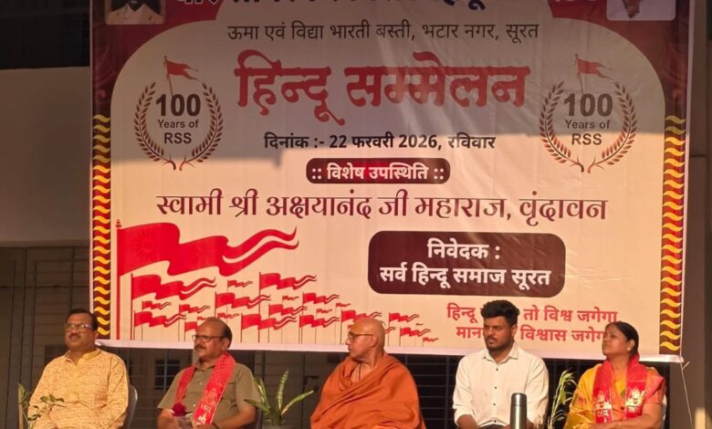 सूरत। विश्व के सबसे बड़े स्वयंसेवी संगठन राष्ट्रीय स्वयंसेवक संघ के शताब्दी वर्ष (100 वर्ष ) पूर्ण होने के उपलक्ष में उमा एवं विधा भारती बस्ती,भटार नगर द्वारा वीर सावरकर विराट हिंदू सम्मेलन का आयोजन रविवार को शाम 4:30 बजे से श्री उत्तर गुजरात स्कूल में मनाया गया. संघ कार्यकर्ता बसंत खैतान ने बताया कि इस अवसर पर मुख्य अतिथि वृंदावन धाम से विशेष रूप से पधारें स्वामी श्री अक्षयानंद जी महाराज,मुख्य वक्ता कुटुंब प्रबोधन के सुरत महानगर संयोजक श्री ओमप्रकाश जी मोदी एवं अतिथि विशेष के रूप में पारस जी चपलोत,मधु जी जालान,हर्ष भाई शैलेश कुमार जी,उपस्तिथ रहे. इस अवसर पर काफ़ी संख्या में हिंदू समाज की माताएँ,बहनें एवं युवा साथी उपस्तिथ रहे.उपस्तीथ वक्ताओ ने संघ की 100 वर्ष की यात्रा पर विस्तार से जानकारियाँ साझा की.