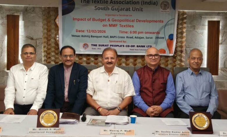 सूरत। द टेक्सटाइल एसोसिएशन इंडिया (टीएआई) के दक्षिण गुजरात इकाई द्वारा 12 फरवरी 2026 को अडाजण स्थित क्षितिज बैंक्वेट हॉल में “इम्पैक्ट ऑफ बजट एंड जियोपॉलिटिकल डेवलपमेंट्स ऑन एमएमएफ टेक्सटाइल्स” विषय पर एक महत्वपूर्ण सेमिनार का आयोजन किया गया।सूरत पीपल्स बैंक प्रायोजित इस कार्यक्रम में उद्योग जगत के अग्रणी उद्यमियों, टेक्नोक्रेट्स एवं विशेषज्ञों ने बड़ी संख्या में भाग लिया।