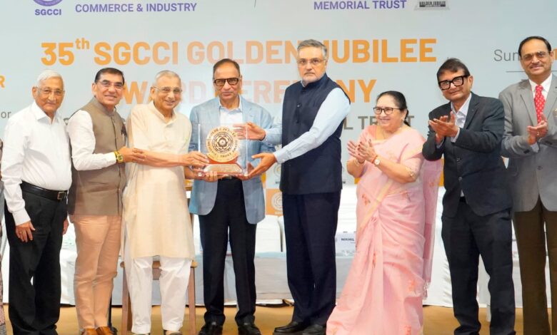 सूरत। द सदर्न गुजरात चेंबर ऑफ कॉमर्स एंड इंडस्ट्री (SGCCI) गोल्डन जुबिली मेमोरियल ट्रस्ट द्वारा रविवार को सरसाणा स्थित प्लेटिनम हॉल में भव्य अवॉर्ड समारोह का आयोजन किया गया। वर्ष 2024-25 के लिए विभिन्न 15 श्रेणियों में उत्कृष्ट प्रदर्शन करने वाले उद्योगपतियों और संस्थाओं को प्रतिष्ठित अवॉर्ड प्रदान किए गए।