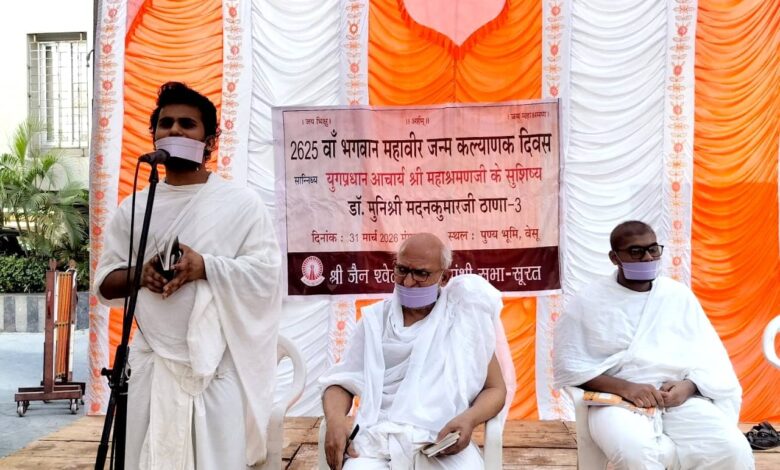 सूरत। भगवान महावीर के 2625वें जन्म कल्याणक दिवस के अवसर पर सूरत के वेसु स्थित पुण्यभूमि अपार्टमेंट्स में आचार्य श्री महाश्रमणजी के सुशिष्य मुनि श्री डॉ. मदनकुमारजी के सान्निध्य में जैन श्वेतांबर तेरापंथी सभा, सूरत एवं पुण्यभूमि क्षेत्र परिवार के संयुक्त तत्वावधान में भव्य आयोजन किया गया। कार्यक्रम में बड़ी संख्या में श्रावक-श्राविकाओं की उपस्थिति रही और श्रद्धालुओं ने भगवान महावीर के संदेशों को श्रवण कर धर्मलाभ प्राप्त किया।